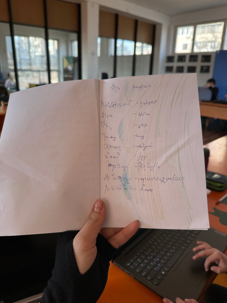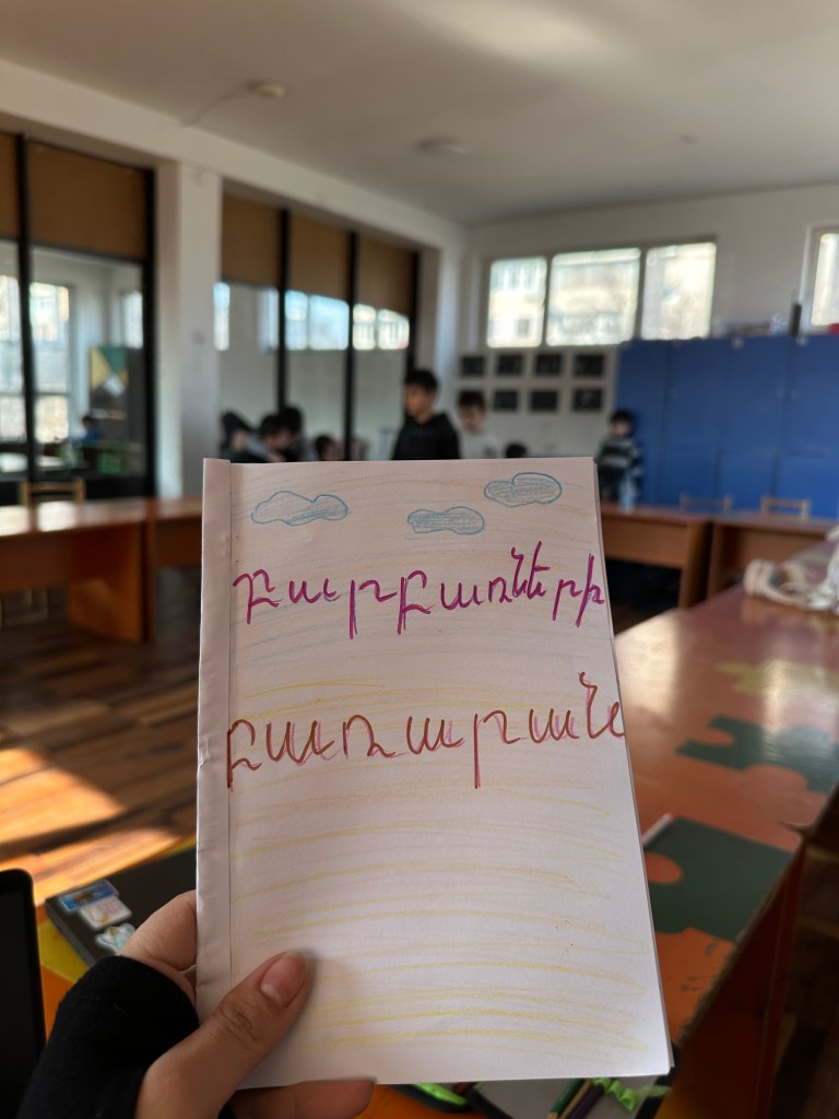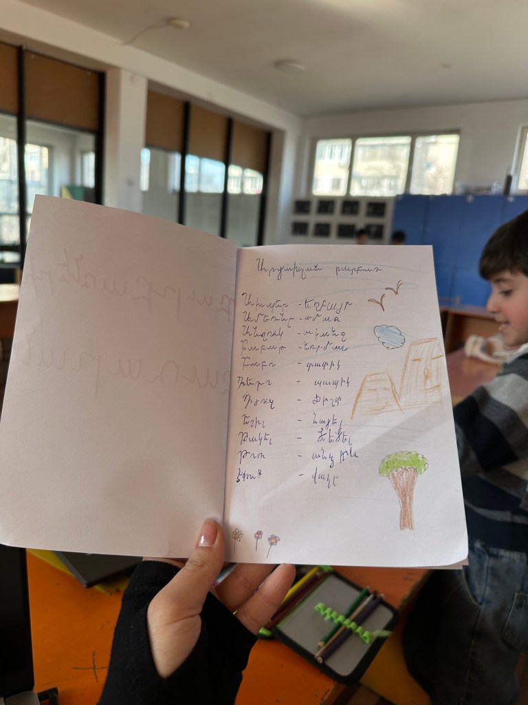 Կամավորական աշխատանքիս վերջին օրը կախարդական էր։ Երեխաների հետ տեղափոխվել էինք բառերի աշխարհ, զրուցում, քննարկում էինք բառեր, արտահայտություններ տարբեր բարբառներով, փորձում գտնել դրանց գրական տարբերակները, գրի առնում։ Ձևավորեցինք էջեր և ձեռքի աշխատանքով ստեղծեցինք փոքրիկ «Բարբառների բառարան»։